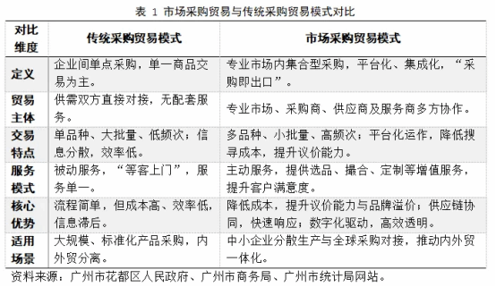 与传统单点采购不同,市场采购强调平台化功能,主动对接上下游需求,协调生产、流通与消费环节。它突破了企业间直接对接的模式,形成“市场-采购商-供应商”多方协作网络,涵盖商品交易与供应链服务,是“贸易+服务”的复合型业态。其贸易主体包括专业市场、采购商、供应商及服务商,核心功能是将分散的中小企业生产与全球采购需求有效对接,推动贸易规模化发展。市场采购贸易与传统采购贸易模式对比见表1。