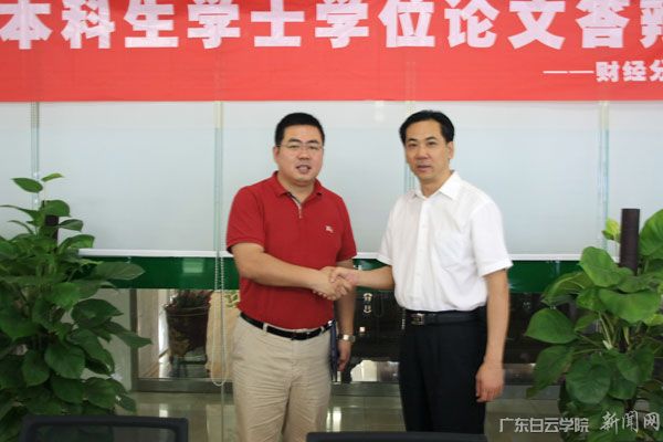 5月9日,广东白云学院2015届国际经济与贸易专业学士学位论文校外公开答辩会在广州市和麦贺达贸易有限公司会议室举行。白云教育集团董事长谢可滔、广东白云学院党委书记刘剑锋、学校实践教学中心主任张国安、财经学院院长沈颂东、校企办主任刘方毅、学生处副处长岳增玲,以及广州市和麦贺达贸易有限公司总经理宫正、财务总监曾伟军、销售总监田黎明等校企领导出席了答辩会。