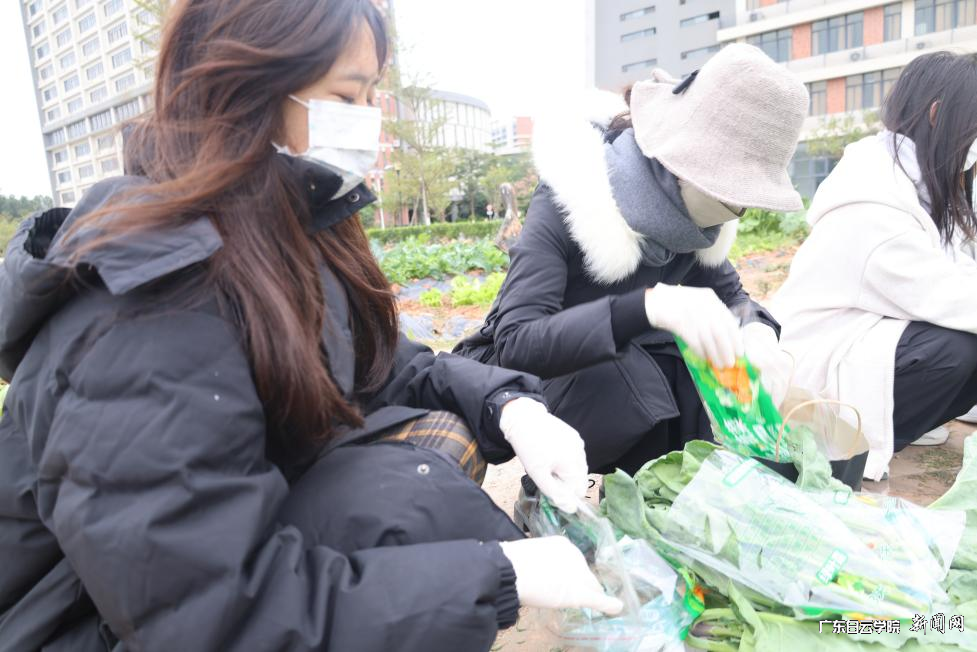 当天活动分为采摘、包装、售卖三个环节。采摘环节主要由23级国贸、数经、金融专业的学生们参与。上午8点半,学生代表在农场集合,张书记先讲解并示范各种蔬菜的采摘和留苗要点,随后学生们进行采摘。从一块地头到另一块地头,尽管冷风强劲,但学生们积极参与,配合默契,一双手套,一把小剪子,很快,每一只筐里都装满了新鲜蔬菜。